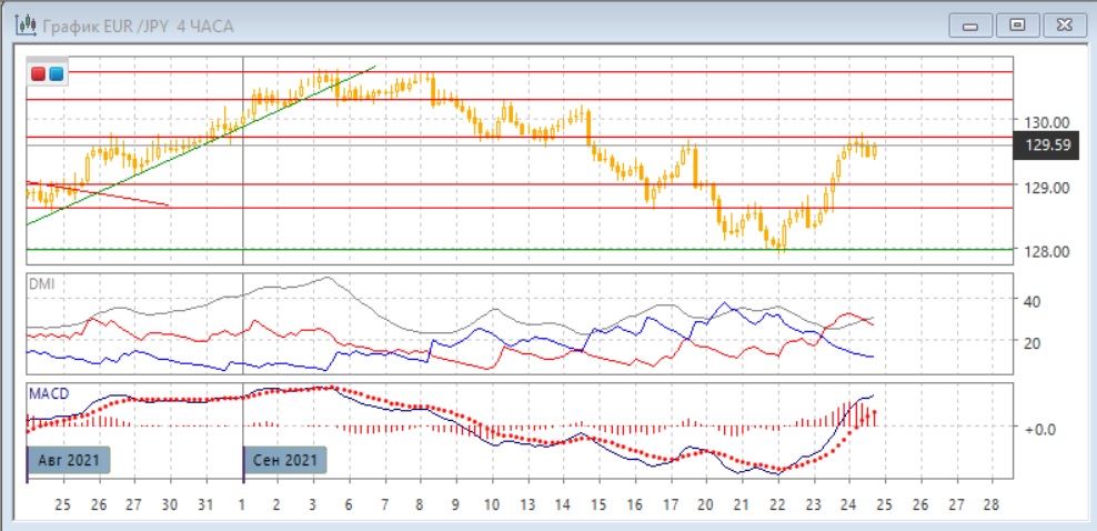На четырёхчасовом графике пара достигла важного в этом масштабе уровня 129,70 - около этого уровня был ряд минимумов и максимумов с конца августа. Откат от сильного сопротивления пока небольшой, и это может говорить о сильной поддержки для пары. По индикаторам направленного движения тенденцией стал рост: DM+ выше DM-, гистограмма MACD в положительной зоне, линия MACD имеет положительный наклон. При преодолении 129,70 пара может достигнуть максимумов сентября у 130,70.