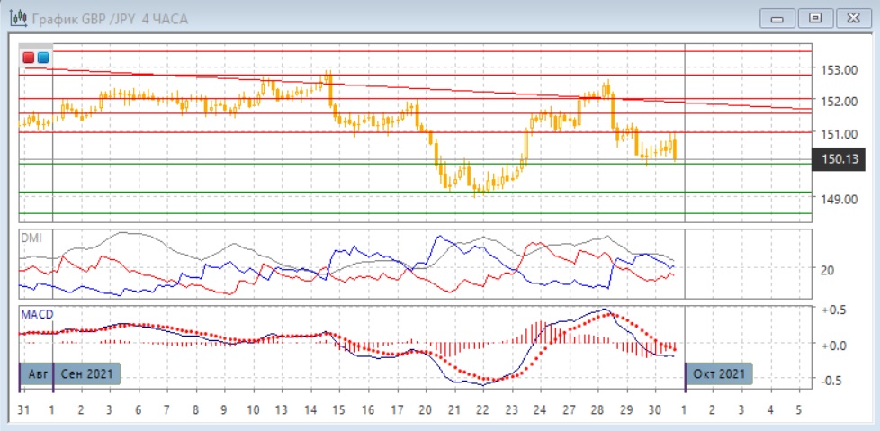 На четырёхчасовом графике отскок от 150,00 был ограничен на 151,00, после чего пара приблизилась к исходному уровню отскока вверх. Резкое снижение от 151,00 предполагает, что продолжение снижения с преодолением уровня 150,00 сейчас выглядит более вероятным. При преодолении уровня 150,00 целью видится поддержка на минимумам 20-22 сентября у 149,15.