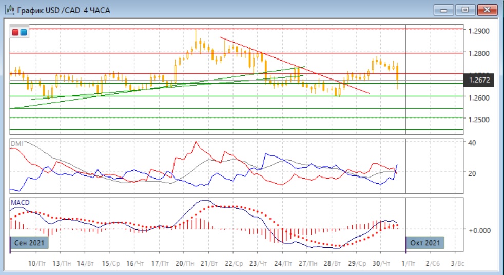 На четырёхчасовом графике образовалась широкодиапазонная свеча снижения, что может предполагать продолжение импульса в краткосрочной перспективе. Если пара останется ниже 1,2700, вероятно, снижение продолжится до следующего "круглого" уровня 1,2600. В цело пара остаётся в диапазоне, так как переход к росту в сентябре был неудачным, а поддержка на 1,2600 сильная.
