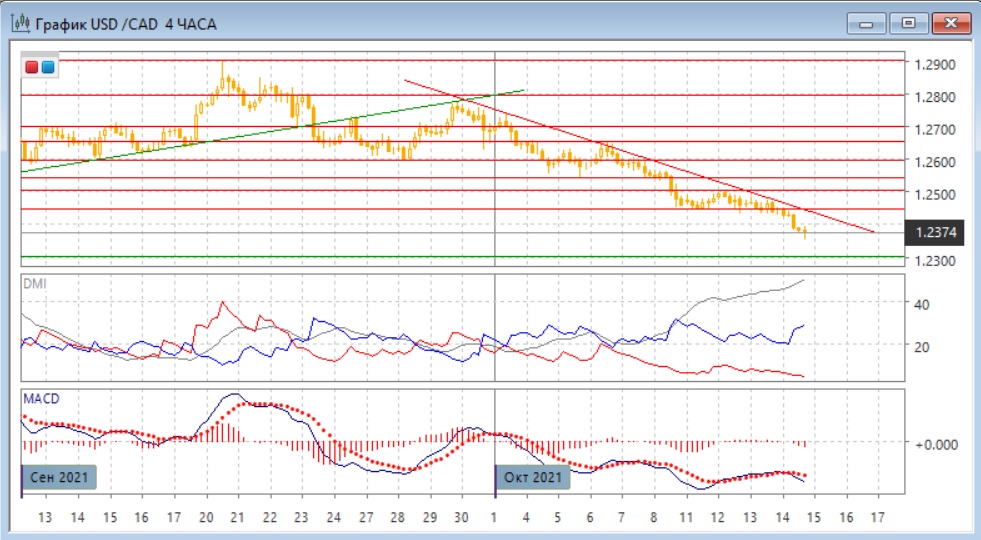 На четырёхчасовом графике снижение продолжилось после выхода вниз из консолидации 1,2450-1,2500. Пара остаётся ниже линии тренда, и относительные максимумы пары продолжают снижаться. По ADX в этом масштабе снижение является сильной тенденцией: превышение DM- над DM+ очень большое, ADX на очень высоком уровне и растёт. Однако образовалось бычье расхождение минимумов пары и гистограммы MACD, это показывает, что происходит замедление снижения и увеличивается вероятность отскока вверх. Этот сигнал не имеет подтверждения, и пока идти против сильной тенденции слишком рискованно.