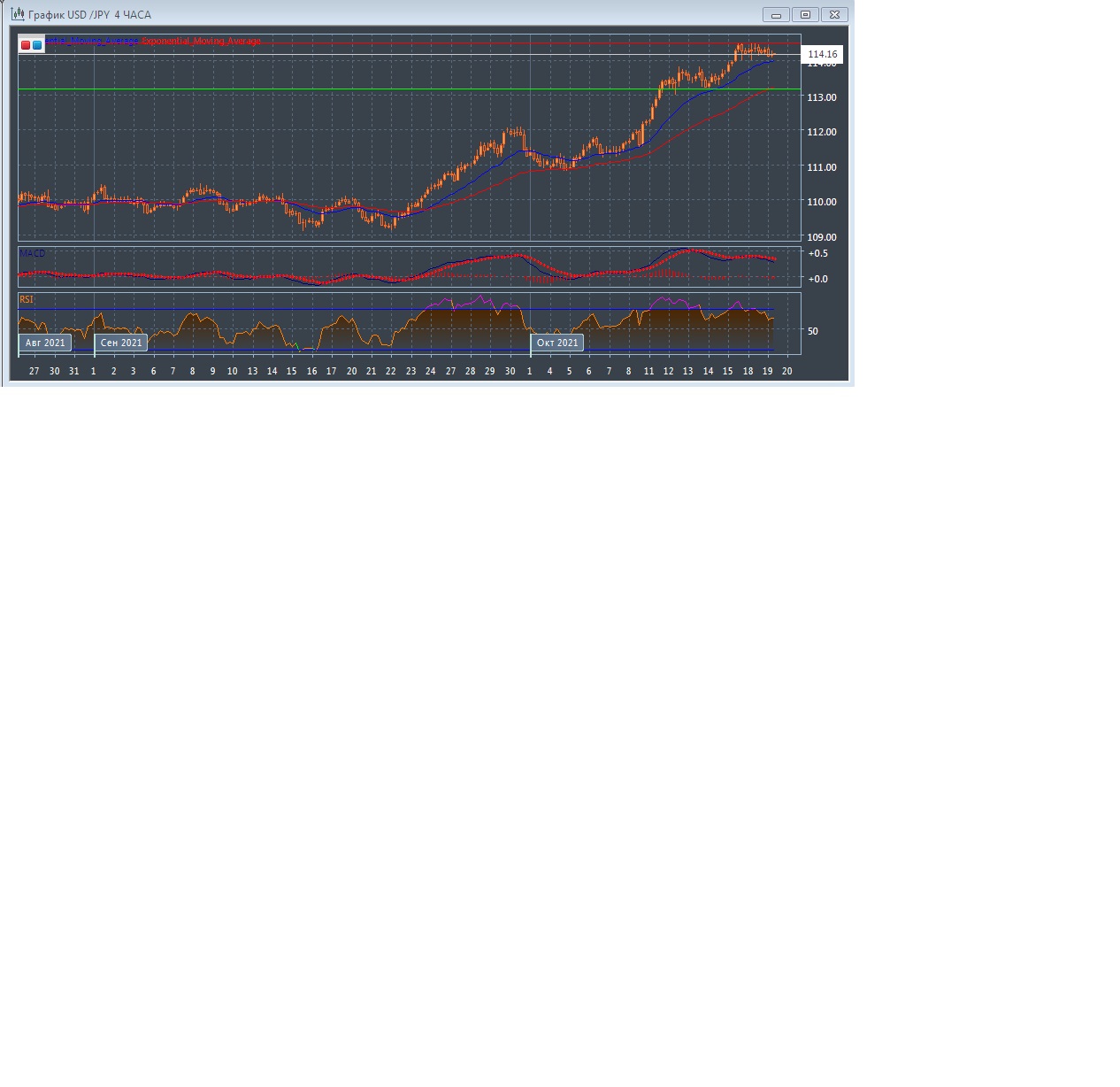 Скользящие средние с периодом 21 и 55 дней продолжают движение вверх, сохраняя приличное расхождение, что свидетельствует о продолжении восходящей тенденции на этом рынке в краткосрочной перспективе. Четырёхчасовой график всё так же прогрессирует в области выше экспоненциальных скользящих средних, подтверждая дальнейшее развитие восходящего тренда на этом рынке в краткосрочной перспективе.