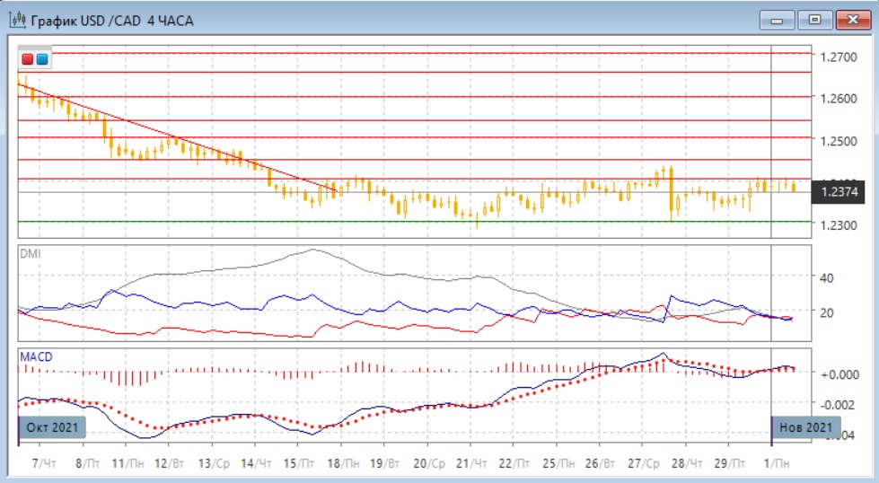 На четырёхчасовом графике пара продолжает находиться в диапазоне 1,2300-1,2400. Так как пара после тестирования верхней границы 1,2400 снизилась, более вероятным является снижение к нижней границе на 1,2300. По индикаторам направленного движения пара во флэте (что соответствует диапаозону): DM+ и DM- близки, гистограмма MACD находится около нулевого уровня, линия MACD примерно горизонтальна. Учитывая, что слабые движения могут сохраняться до важных катализаторов (на этой неделе пройдёт заседание ФРС по денежной политике и выходят данные по занятости в США и в Канаде), в ближайшей перспективе пара, вероятно, останется в диапазоне.