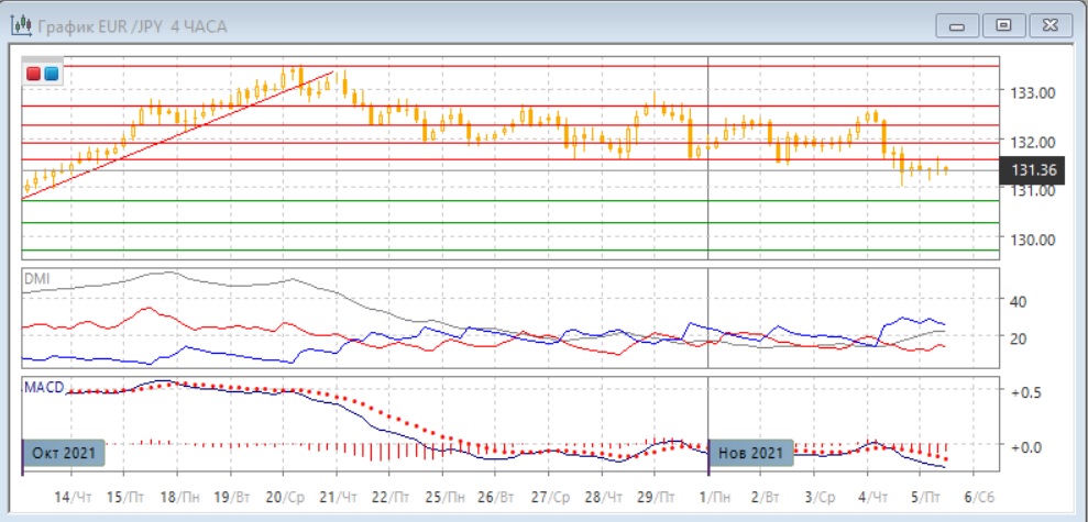 На дневном графике пара закрытие в четверг было ниже нижней границы диапазона 131,60-132,50. Уровень 131,60 может стать ближайшим сопротивлением. Также в четверг образовалась широкодиапазонная свеча снижения. Так как пара вышла из диапазона вниз, скорее краткосрочно она будет снижаться. Исходя из размера диапазона целью может быть следующий сильный уровень поддержки 130,70. По индикаторам направленного движения пара может перейти к снижению: DM+ и DM- пересеклись, по более краткосрочным индикаторам пара снижается: MACD снижается в отрицательной зоне, линия MACD имеет отрицательный наклон.
