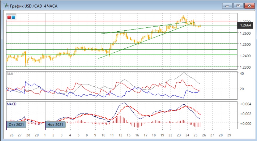 На четырёхчасовом графике пара преодолела линию тренда, если строить её с 10 ноября. Преодоление линии тренда и переход к снижению относительных максимумов и минимумов пары скорее говорят о развороте в этом масштабе. По более краткосрочным индикаторам направленного движения тенденцией также стало снижение: гистограмма MACD находится в отрицательной зоне, линия MACD имеет отрицательный наклон. Уровень поддержки 1,26555 сейчас тестируется. При закреплении ниже следующей целью становится уровень 1,2600.