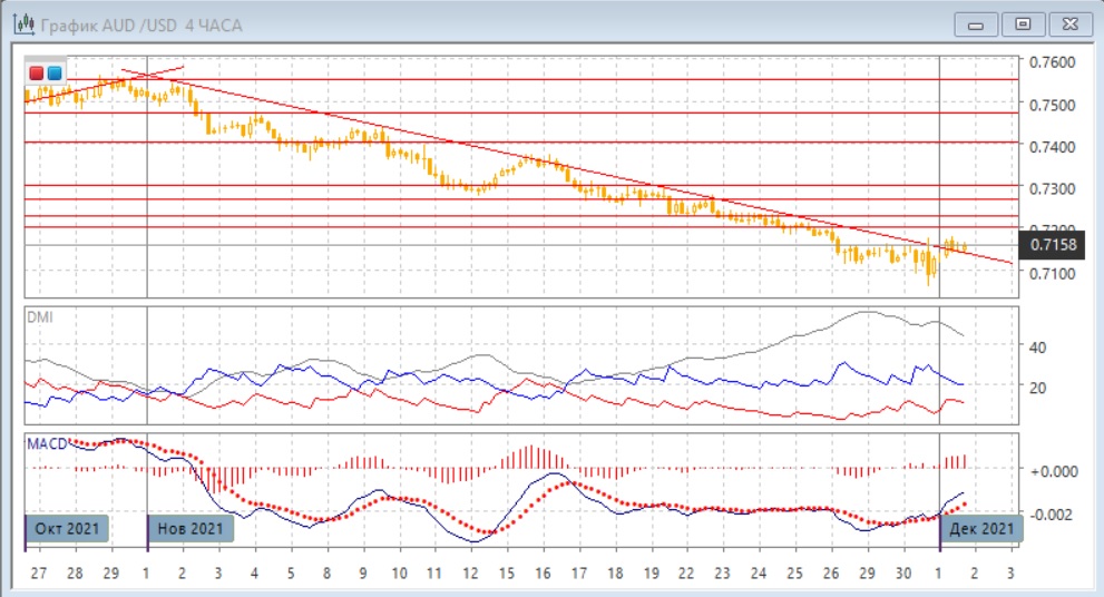 На четырёхчасовом графике может происходить разворот. Кроме отскока пары от "круглого" уровня 0,7100, пара преодолела линию тренда и сейчас оно выступает уже поддержкой при откате. Также пара преодолела относительные максимумы 26-30 ноября у 0,7150. Если пара закрепится выше 0,7150 и, тем самым, выше линии тренда, это сделало бы продолжение отскока вверх предпочтительным. По индикаторам направленного движения коррекция к снижению: превышение DM- над DM+ сохраняется, но гистограмма MACD уже в положительной зоне, линия MACD получила положительный наклон.