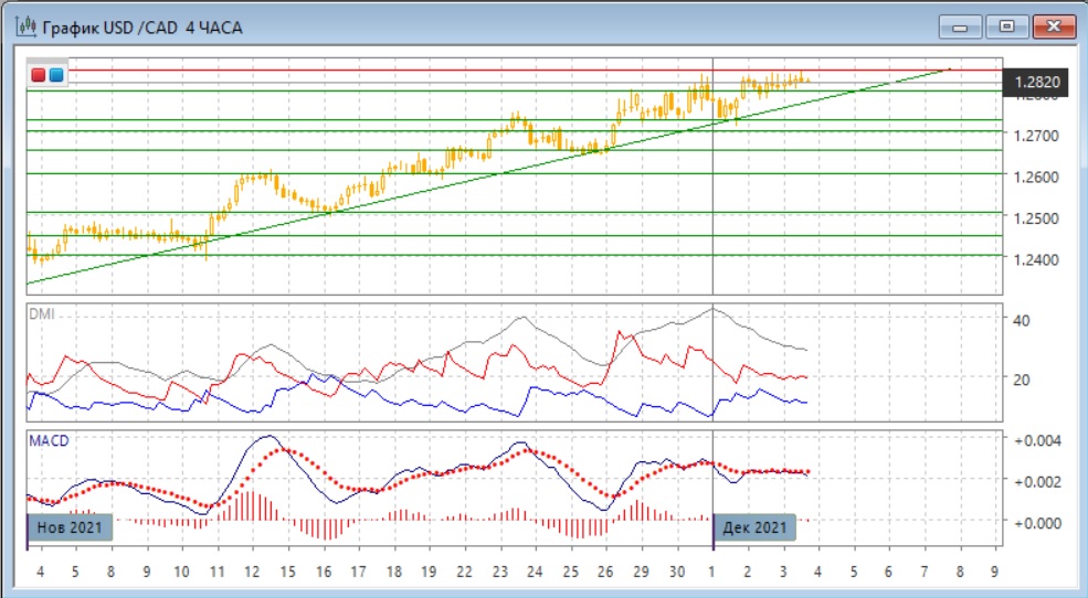 На четырёхчасовом графике увеличение вероятность отката видно из образования медвежьего расхождения максимумов пары и гистограммы MACD, а также сохранения устойчивости сопротивления на 1,2850 - оно тестировалось с 30 ноября, и чем дальше пара не будет способна его преодолеть, тем больше вероятность отката. Сейчас также можно рассматривать треугольник, образованный линией тренда и уровнем 1,2850. Исходя из того, что треугольник направлен вверх, и он образован в волне роста, выход вверх более вероятен, если это выход будет вниз с преодоление линии тренда, это изменило бы картину.