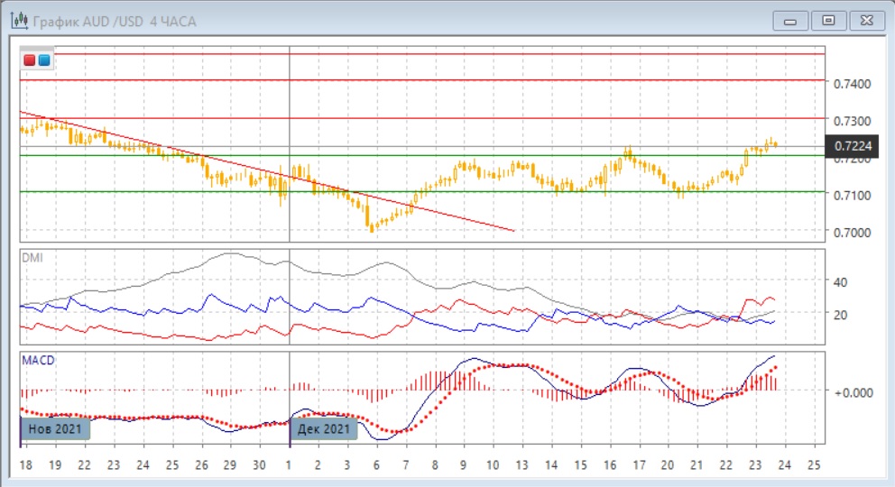 На дневном графике пара после закрытия выше верхней границы консолидации 0,7100 и 0,7200 продолжила рост. Так как выход из консолидации, которая происходила после прорыва линии тренда, был вверх, вероятно более значительное движение вверх. Исходя из того, что пара, как правило, движется между "круглыми" уровнями, следующим сильным сопротивлением является только следующий "круглый" уровень 0,7300. Пара достигла более высокого максимума, чем предыдущий, и это сохраняет последовательность роста относительных максимумов и минимумов. По индикаторам направленного движения пара переходит к росту: DM+ уже выше DM-, гистограмма MACD растёт в положительной зоне, линия MACD имеет положительный наклон.