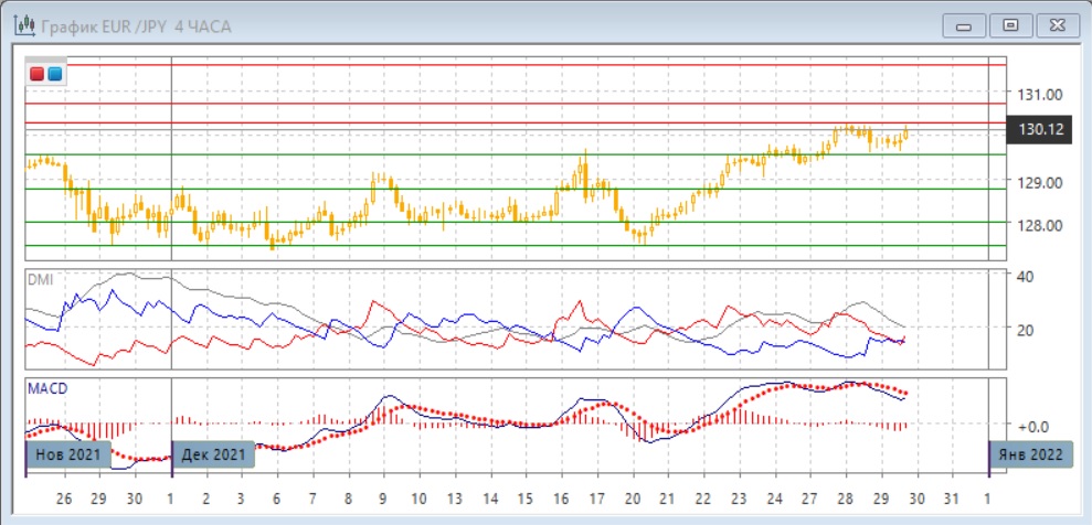 На дневном графике, несмотря на откат от уровня сопротивления 130,30, пара осталась выше верхней ранее преодолённого уровня сопротивления 129,55. Продолжение роста остаётся предпочтительным. По индикаторам направленного движения тенденцией является рост: превышение DM+ над DM- увеличивается, гистограмма MACD остаётся в положительной зоне, линия MACD имеет положительный наклон.