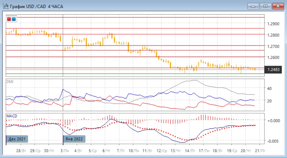На дневном графике пара остаётся около важного с психологической точки зрения уровня 1,2500. Несмотря на образование около него двух "молотов", в первом случае сигнал разворота не получил подтверждения, во втором случае это может повториться: пара снижается после образования "молота" в среду и скорее закрытие будет ниже уровня 1,2500, что может быть сигналом о его преодолении. В более широкой перспективе тенденция снижения остаётся сильной. Относительные максимумы и минимумы пары снижаются, по индикаторам направленного движения тенденция сильная: превышение DM- над DM+ большое при относительно высоком уровне ADX, гистограмма MACD находится в отрицательной зоне, линия MACD имеет отрицательный наклон.