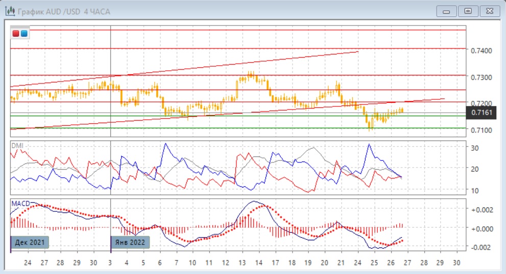 На дневном графике пара осталась ниже нижней границы восходящего канала с декабря, однако после прорыва линии тренда (нижней границы канала) пара получила поддержку на ближайшем "круглом" уровне 0,7100. Продолжение отскока от 0,7100 вверх с преодолением уровня 0,7150 может показывать, что перехода к снижению могло и не произойти. Если с другой точки зрения рассматривать движение с начала декабря как движение в канале 0,7100-0,7300, то более вероятным выглядит рост к 0,7300. Это больше подходило бы фундаментальным данным. По индикаторам направленного движения слабая тенденция снижения: превышение DM- над DM+ имеется, но при низком уровне ADX, гистограмма MACD осталась вблизи нулевого уровня, а линия MACD имеет небольшой отрицательный наклон.