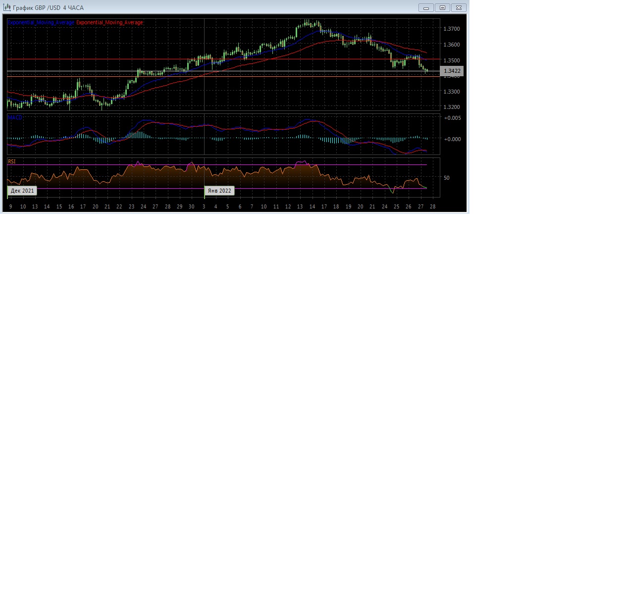 На четырёхчасовом графике скользящие средние продолжают движение вниз и увеличивают расхождение, что так же свидетельствует в пользу медвежьего тренда на этом рынке.