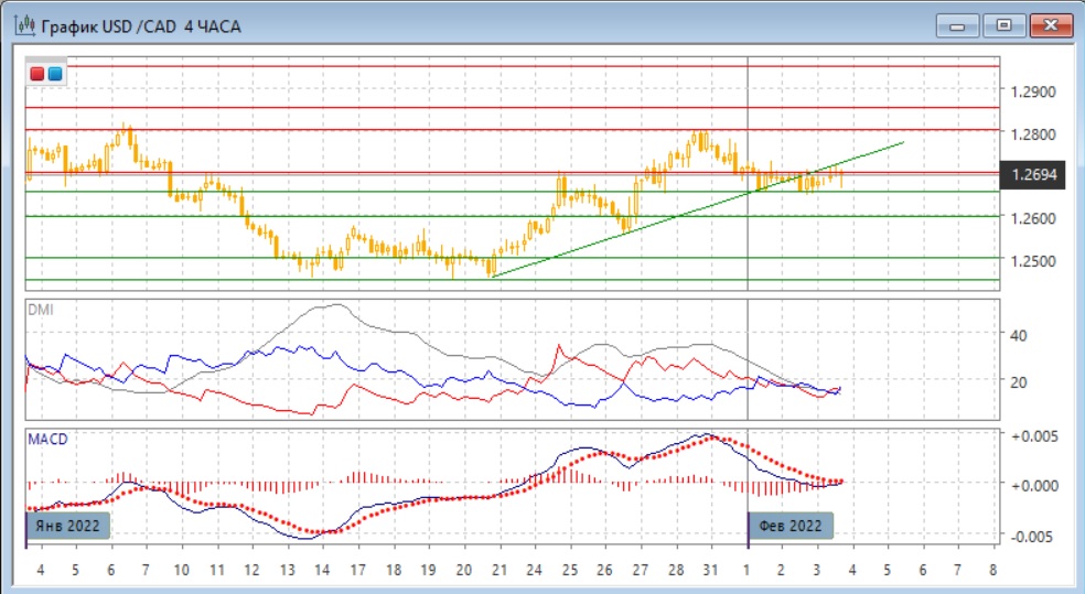 На четырёхчасовом графике пара находится ниже линии восходящего тренда с 20 января. Он остаётся в диапазоне 1,2655-1,2700 с начала февраля. Дальнейшее движение, вероятно, будет в сторону выхода из этого диапазона. Небольшое превышение 1,2700 ограничивалось линией тренда, которая выступает сейчас сопротивлением.