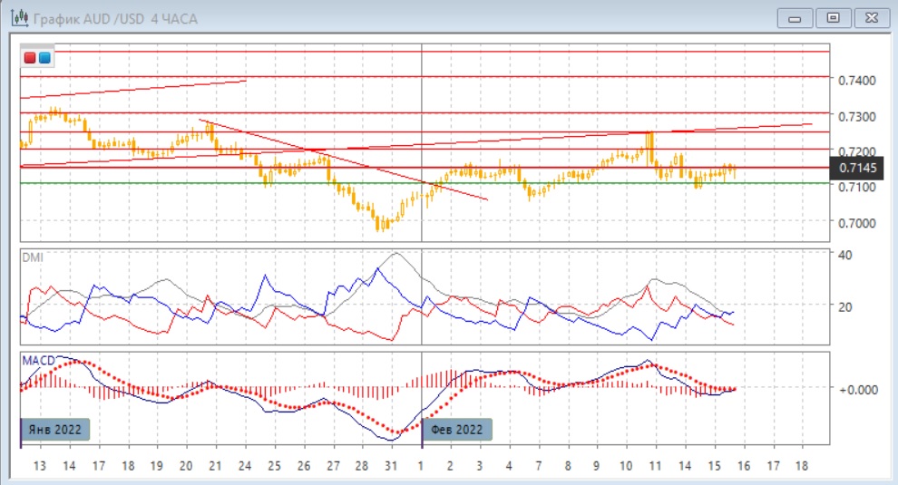 На четырёхчасовом графике пара стабилизировалась выше "круглого" уровня 0,7100, и происходит консолидация в диапазоне как в начале февраля: 0,7100-0,7150. Дальнейшее движение, вероятно, будет в сторону выхода из диапазона. По ADX пара во флэте: DM+ и DM- близки, ADX на низком уровне. Однако по более краткосрочным индикаторам тенденцией становится рост: гистограмма MACD растёт и приближается к положительной зоне, линия MACD разворачивается.