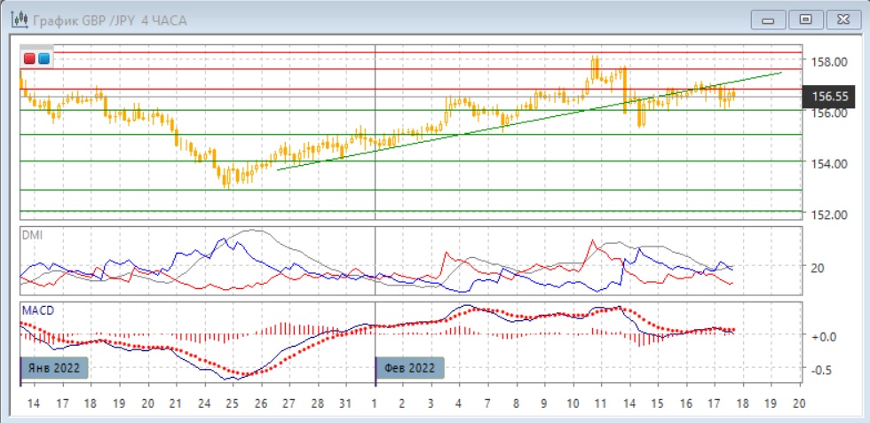 На четырёхчасовом графике ситуация почти нейтральная. С одной стороны, пара осталась ниже линии тренда с конца декабря и ниже сопротивления на 156,85. С другой стороны, пара осталась выше уровня поддержки на 156,00который был укреплён при образовании "ложного пробоя" 14 февраля. Дальнейшее движение, вероятно, будет в сторону выхода пары из текущего узкого диапазона 156,00-156,85.
