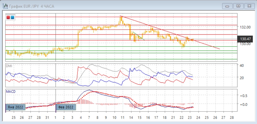 На четырёхчасовом графике вернулась к точке выхода вниз из треугольника, образованного нисходящей линией тренда с 10 февраля и уровнем 130,30/130,00. Само возвращение может быть бычьим сигналом, но до преодоления линии тренда он не имеет подтверждения. При закрытии выше линии тренда пара может вернуться к сопротивлению на 131,60 и далее 132,15. Последовательность снижения относительных максимумов и минимумов пары сохраняется, но образовалось бычье расхождение минимумов пары и гистограммы MACD, что показывает замедление и увеличивает вероятность разворота. В ближайшей перспективе пара, вероятно, будет двигаться в направлении движения от уровня 130,30 (либо преодоление линии тренда, либо возобновление снижения).