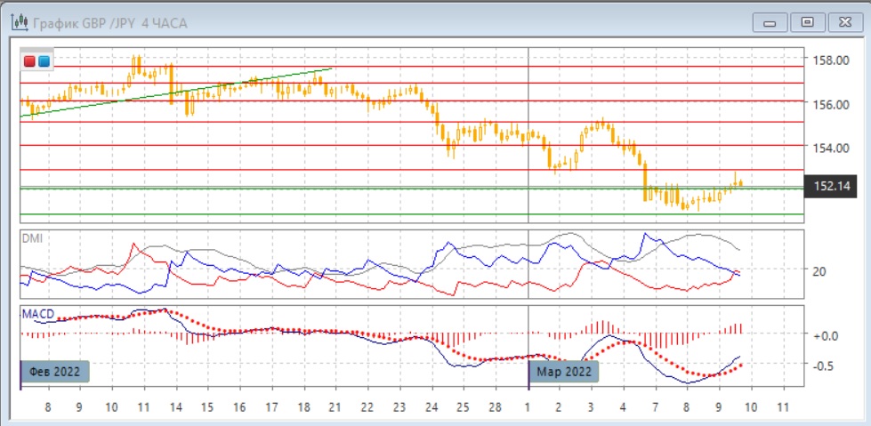 На четырёхчасовом графике пара преодолела уровень сопротивления 152,00, который ограничивал пару с 4 марта. Это предполагает возможность развития движения вверх, хотя снижение после достижения ближайшего сопротивления на 152,85 оказывает, что если тенденцией является рост, то она слабая. В ближайшей перспективе пока пара выше 152,00, рост кажется более вероятным.