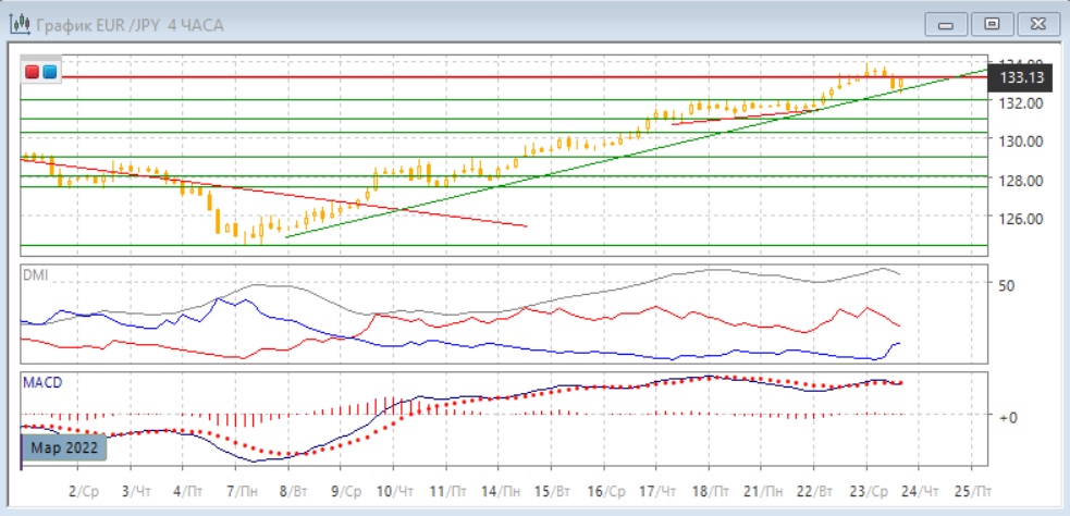 На дневном графике пара достигла важного долговременного сопротивления на 133,25 - у максимумов октября и февраля. После очень большой во размеру волны роста без откатов с начала марта достижение сильного уровня сопротивления, и полная нейтрализация предыдущего снижения увеличивают вероятность отката, так как он уже назрел (размер волны роста составил 950 пунктов). Снижение пары после прокола уровня 133,25 потенциально создаёт картину ложного пробоя, что увеличит вероятность отката, если пара останется ниже 133,25.