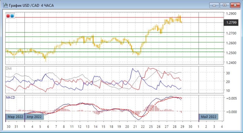На четырёхчасовом графике можно выделить диапазон 1,2800-1,2850, при этом пара снизилась к нижней границе диапазона после ложного прорыва выше 28 апреля. Это увеличивает вероятность выхода из диапазона вниз. Другой медвежий сигнал в этом масштабе - образование медвежьего расхождения максимумов пары и гистограммы MACD. Преодоление уровня 1,2800 послужило бы подтверждением сигнала. Дальнейшее движение в этом масштабе, вероятно, будет в сторону выхода из диапазона 1,2800-1,2850.