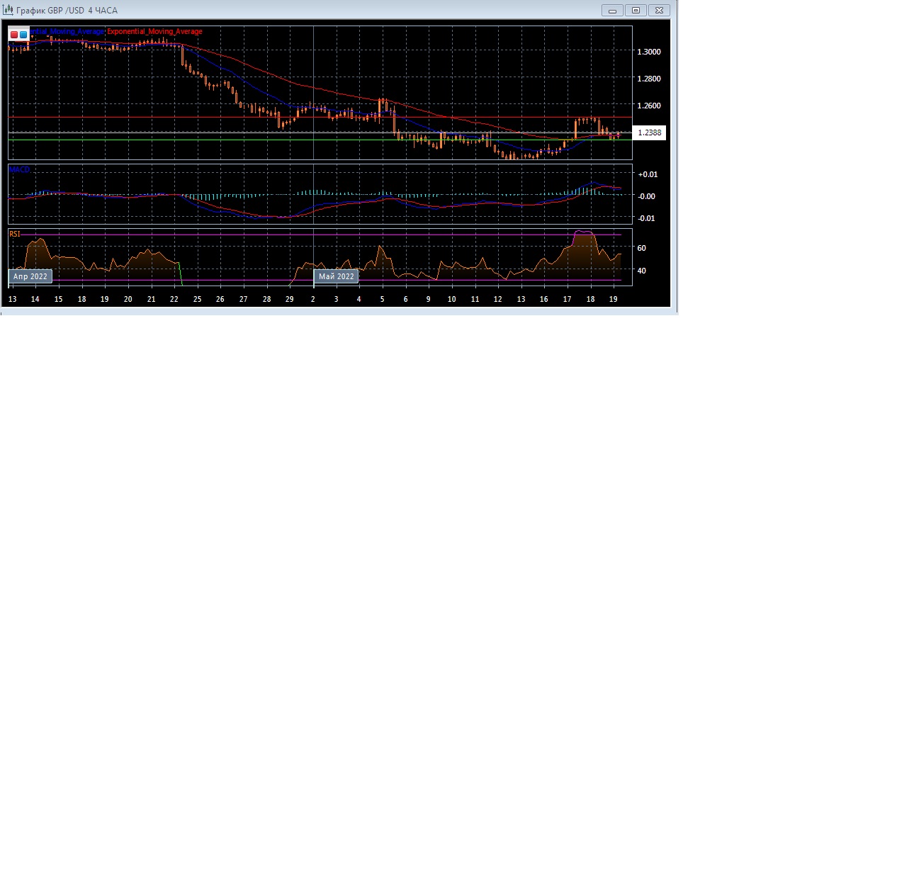 На четырёхчасовом графике скользящие средние двигаются параллельно, минимизировав расхождение, что свидетельствует о равном потенциале противоборствующих сторон и неопределённости текущего тренда.