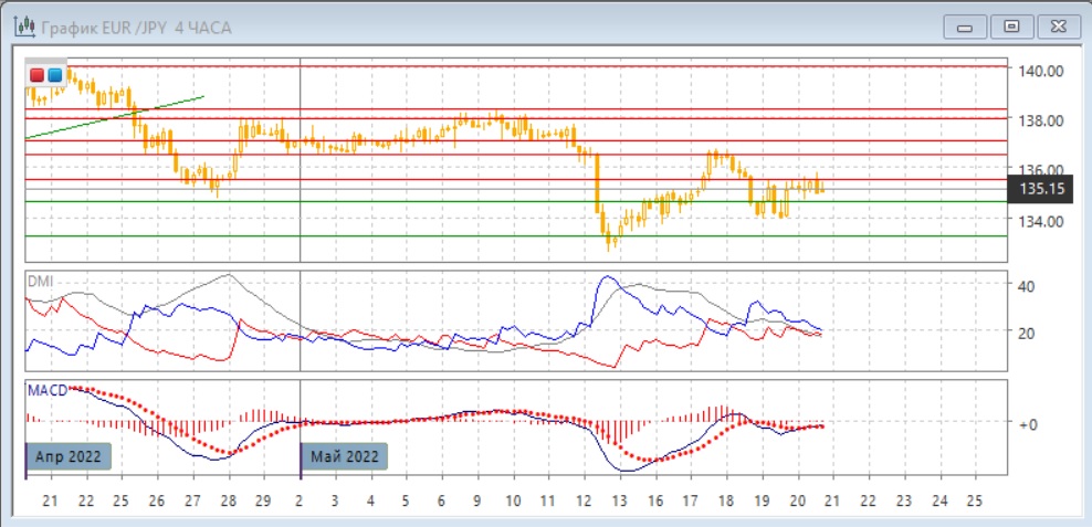 На четырёхчасовом графике отскок вверх ограничен уровнем сопротивления 135,55. Так как там, кажется, образуется третий откат за две сессии, то более вероятным сейчас видится снижение - прорыв явно не поддерживается. Но при откате, учитывая примерно нейтральное состояние, что видно в том числе по образованию свечей "дожи", пара может получить поддержку уже на ближайшем уровне 134,60. По индикаторам направленного движения выраженной тенденции нет: DM+ и DM- близки, гистограмма MAСD около нуля, линия MACD близка к горизонтали.