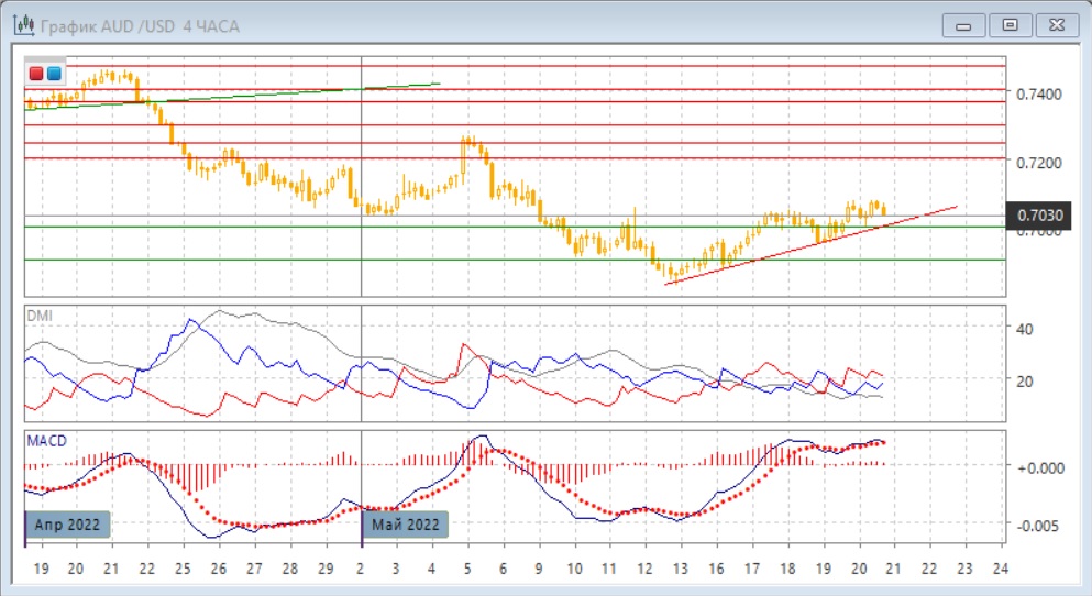 На четырёхчасовом графике пара перешла к росту: относительные максимумы и минимумы сейчас последовательно растут, уровень 0,7000 после преодоления выступил уже поддержкой при откате 20 мая, что является подтверждением преодоления уровня. Также пара находится выше линии восходящего тренда, если строить его с 12 мая. Пока пара выше 0,7000, рост в этом масштабе кажется предпочтительным.
