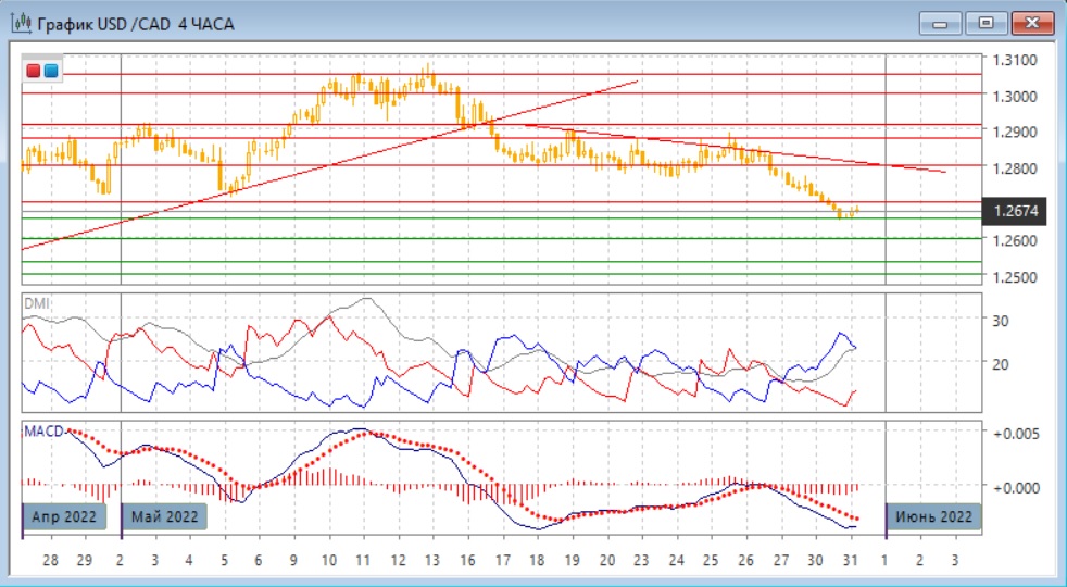 На четырёхчасовом графике произошёл небольшой отскок вверх от уровня поддержки 1,2655, но он пока не получил развития. Пара остаётся ниже ближайшего сопротивления на 1,2700. До этого размер волны снижения без коррекций достиг 200 пунктов, что для этого масштаба много. Отсутствие заметной коррекции сейчас является медвежьим сигналом: поддержка для пары сейчас слабая и направлением наименьшего сопротивления является снижение. По индикаторам направленного движения тенденцией является снижение: DM- значительно выше DM+ при относительно высоком уровне ADX, гистограмма MACD остаётся в отрицательной зоне, линия MACD имеет отрицательный наклон.
