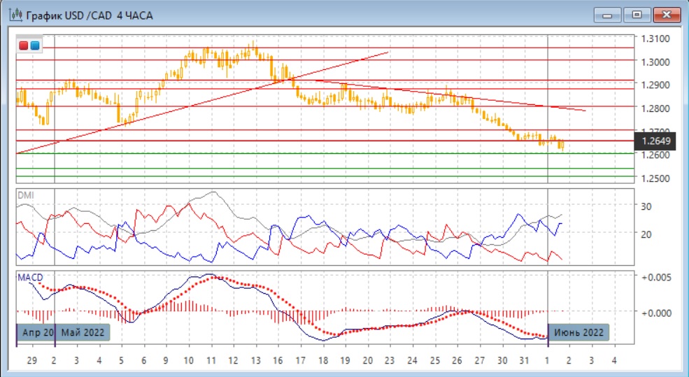 На четырёхчасовом графике видно замедление снижения, так как новые минимумы пары не подтверждаются новыми минимумами по гистограмме MACD. При этом последовательность снижения относительных максимумов и минимумов пары не нарушена. При отскоке сопротивление может быть на ближайшем "круглом" уровне 1,2700. Коррекция и в этом масштабе выглядит назревшей, так как с 25 мая снижение шло беспрерывно.