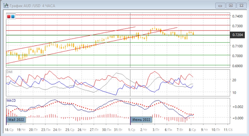 На четырёхчасовом графике пара ещё раз встретила сопротивление на уровне 0,7250. Около него может образоваться третий максимум, что укрепляет уровень в краткосрочной перспективе, так как показывает отсутствие поддержки для дальнейшего роста на данный момент. Консолидация ниже 0,7250 в после отскока вверх от минимумов июня может быть бычьим сигналом, так как быстрого отката, как 6 и 7 июня, не происходит. Движение в ближайшей перспективе, вероятно, будет в сторону отхода от 0,7250: при преодолении этого уровня пара скорее достигнет следующего "круглого" уровня 0,7300, это будет также близко к предыдущему максимуму июня. При образовании максимума откат может развиваться до 0,7150 даже при движении в диапазоне.