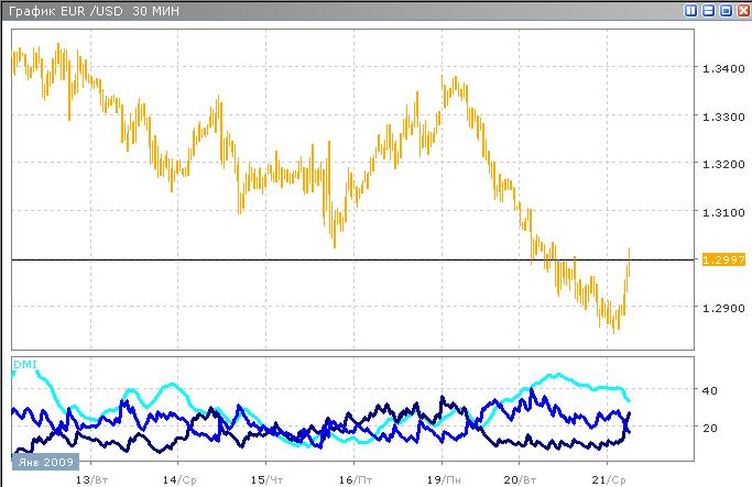 Евро неплохо вырос против доллара за сегодняшнюю ночь, поднявшись с 1.2861 до 1.2985, после чего начал колебания вблизи уровня 1.2970. Это первый значительный рост после двух дней падений, но индикаторы не позволяют точно предсказать, продолжится ли он, или потеряет силу. ADX показывает снижение ниже 40, что свидетельствует об ослаблении тренда. Показания DI+ превышают показания DI-, что позволяет предположить, что рост всё-таки продолжится. Если пара продолжит расти, то за день евро может достигнуть уровня 1.3000-1.3750. Возможно также, что продолжатся колебания как вблизи указанного уровня, так и с более или менее значительными отклонениями от него.
