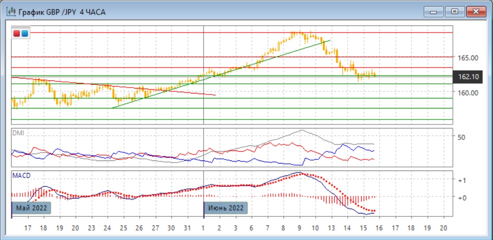 На четырёхчасовом графике снижение замедляется, что видно по отсутствию подтверждения новых минимумов пары новыми минимумами по MACD и разворотом линии MACD к горизонтали. Тем не менее, тенденция снижения не нарушена: последовательность снижения относительных максимумов и минимумов пары сохраняется. По ADX тенденция снижения хорошо выражена: превышение DM- над DM+ большое и устойчивое при высоком уровне ADX. Продолжение снижения кажется более вероятным в краткосрочной перспективе, пока пара ниже сопротивления на 163,40.