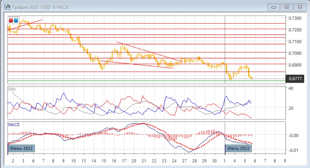 На четырёхчасовом графике пара вернулась к предыдущему минимуму у 0,6760. Последовательность снижения относительных максимумов и минимумов пары сохраняется. Учитывая более завершение коррекции с возвращением к исходному уровню и более долгосрочную тенденцию снижения, скорее снижение будет продолжаться. Исходя из размера фигуры, при преодолении 0,6760 целью может быть уровень 0,6630. По индикаторам направленного движения и в этом масштабе тенденцией является снижение: DM- значительно выше DM+ при выросшем ADX, гистограмма MACD остаётся в отрицательной зоне, линия MACD имеет отрицательный наклон.