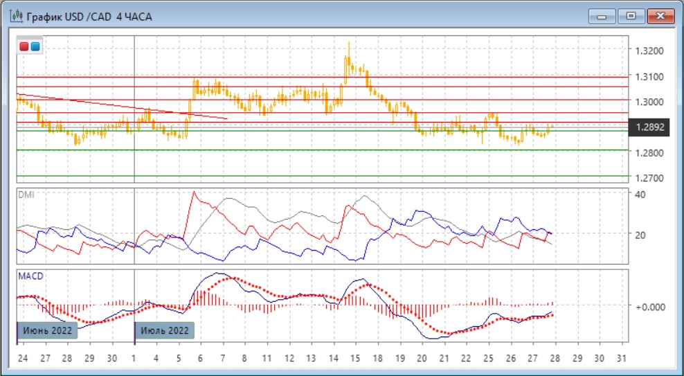 На четырёхчасовом графике снижение приостановилось при приближении к следующему "круглому" уровню 1,2800. При отскоке вверх пара достигла ближайшего сильного сопротивления на 1,2910. Ниже 1,2950 (нижней границы диапазона в первой половине июля) снижение будет оставаться предпочтительным как с точки зрения более долгосрочной тенденции, так и в рамках движения в диапазона в конце июля (1,2800-1,2950). Сигнал бычьего расхождения минимумов пары и гистограммы MACD пока не был подтверждён, и это уже не первое образование расхождения - однако, поддержку на 1,2800 из-за этого можно считать усилившейся.