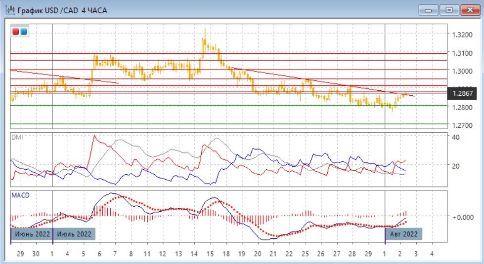 На четырёхчасовом графике пара остаётся ниже уровня сопротивления 1,2875, он укрепляется наличием здесь же линии нисходящего тренда, если строить его с 19 июля. Если пара преодолеет эту зону, можно будет ожидать продолжения роста. Пока более вероятным кажется возобновление снижения и возвращение к нижней границе диапазона последних дней 1,2800.