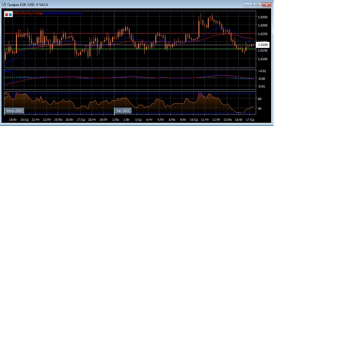На торгах в Азии в среду валютная пара EUR/USD торгуется с небольшим понижением котировок, оставаясь в рамках уровня поддержки в районе 1.0155 при уровне сопротивления в районе 1.0247. Четырёхчасовой график развивается ниже экспоненциальных скользящих средних, демонстрируя нисходящий потенциал этого рынка в краткосрочной перспективе.