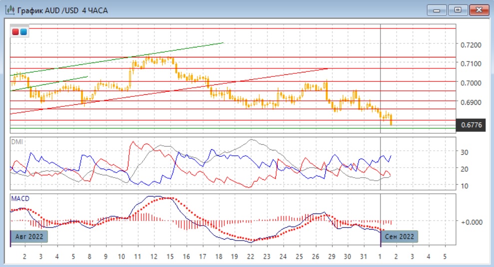 На четырёхчасовом графике пара преодолела нижнюю границу канала 0,6860-0,6950 и снижение продолжатся, пара преодолела поддержку на "круглом" уровне 0,6800. Ближайшая цель на уровне поддержки 0,6760 уже близко. Выход пары из относительного долгого диапазона во второй половине августа предполагает более сильное движение, и более вероятно, что снижение будет продолжаться. Относительные максимумы и минимумы последовательно снижаются, по индикаторам направленного движения тенденцией является снижение: превышение DM- над DM+ увеличилось, уровень ADX немного вырос, гистограмма MACD остаётся в отрицательной зоне, линия MACD имеет отрицательный наклон.