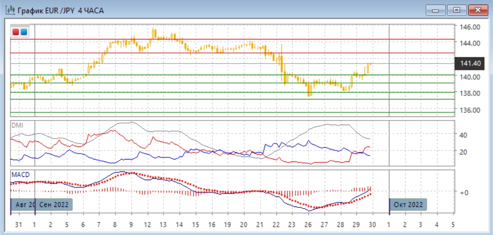 На четырёхчасовом графике пара развернулась, относительные максимумы и минимумы последовательно растут. Бычьими сигналами являются отсутствие существенного отката от уровней сопротивления и отсутствие снижения после образования у уровня сопротивления 140,00 "падающей звезды". Это показывает, что поддержка для снижения сейчас очень слабая и оно не происходит при благоприятных условиях. По индикаторам направленного движения тенденцией стал рост: DM+ теперь выше DM-, гистограмма MACD растёт в положительной зоне, линия линии MACD имеет положительный наклон.
