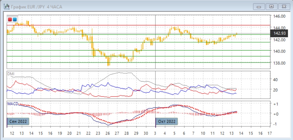 На четырёхчасовом графике пара преодолела уровень 142,70, который в этом масштабе был сильным сопротивлением, и это открывает пространство для движения к следующему сопротивлению на 144,30. Это также завершило бы коррекционное снижение (если рассматривать снижение с 5 октября как коррекцию).