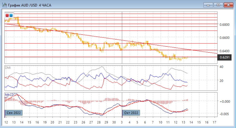 На четырёхчасовом графике снижение приостановилось и пара тестирует сопротивление на "круглом" уровне 0,6300. По более краткосрочным индикаторам есть предпосылки к переходу к росту: гистограмма MACD растёт в положительной зоне, линия MACD получила положительный наклон. Ключевым сейчас является то, будет ли преодолён уровень 0,6300 после выхода данных по индексу потребительских цен в США. Если это произойдёт, пара, вероятно, достигнет следующего сопротивления на 0,6400.