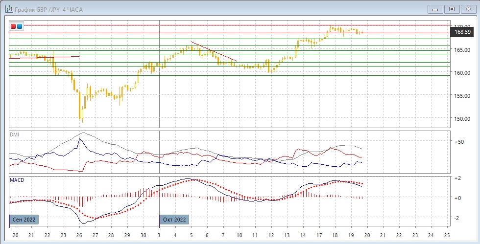 На дневном графике пара вышла из диапазона вверх, преодолев верхнюю границу на 168,35. Сейчас произошёл откат к этому уровню, но пока пара него не преодолела и не вернулась в диапазон. Если это произойдёт, выход из диапазона вверх выглядел бы ложным пробоем. Однако пока пара выше 168,35, сохраняется возможность продолжения роста. Размер волны роста от 160,00 в более 1000 пунктов очень большой для пары, и коррекция даже при сохранении тенденции роста назревала. Ио индикаторам направленного движения тенденцией является рост: DM+ выше DM-, гистограмма MACD растёт в положительной зоне, линия MACD имеет положительный наклон.