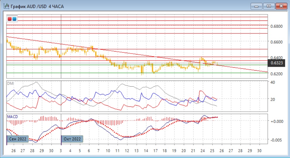 На четырёхчасовом графике пара также осталась в диапазоне 0,6200-0,6355, но теперь консолидация происходит в верхней части диапазона выше 0,6300, что может предварять выход из диапазона вверх. Линия тренда выступает уже уровнем поддержки. Ещё одним бычьим сигналом является то, что пара не снизилась к нижней границе диапазона после ложного пробоя вверх 21-24 октября.
