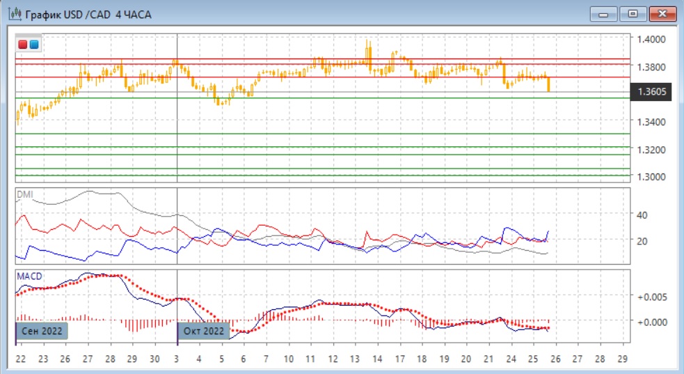 На четырёхчасовом графике пара вышла из диапазона 1,3710-1,3840 вниз. 24 и 25 октября этот уровень был уже сопротивлением для пары. Относительные минимумы и относительные максимумы сейчас снижаются, это указывает на разворот с 13 октября. Сейчас пара приблизилась к сильной поддержке на "круглом" уровне 1,3600, преодоление которого может привести к ускорению движения вниз.