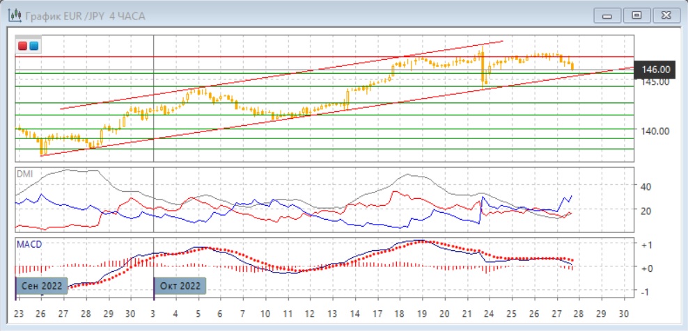 На четырёхчасовом графике пара осталась в канале 145,65-147,35, пара находится в этом диапазоне с 17 октября. Приближение к нижней границе привело к приостановке снижения, и исходя из движения в канале, теперь более вероятен рост к верхней границе.