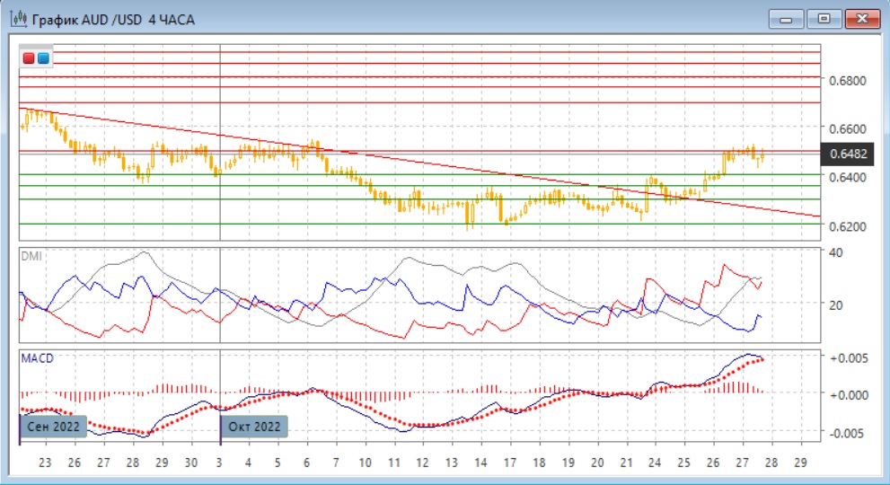 На четырёхчасовом графике продолжается рост после выхода из диапазона 0,6200-0,6355 вверх. Относительные максимумы и минимумы последовательно растут. Откат от "круглого" уровня 0,6500 не получил развития, и он снова тестируется. Пока кажется более вероятным, что уровень 0,6500 будет преодолён и рост продолжится с целью на 0,6700. По ADX рост стал сильной тенденцией: превышение DM+ над DM- большое при высоком уровне ADX.