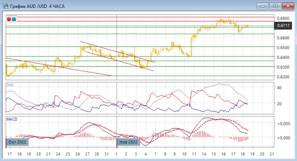 На четырёхчасовом графике пара восстановилась выше уровня 0,6700, но рост с 17 ноября кажется коррекционным к снижению, он постепенно замедляется и образуются верхние тени свечей, что нехарактерно для возобновления тенденции роста. В более широкой перспективе текущий отскок может быть волной в коррекционном движении от 0,6800, и возобновление роста после коррекции кажется более вероятным. Пока сам размер снижения от 0,6800 небольшой относительной волны роста от 0,6400, это также скорее говорит о коррекции, а не о развороте.