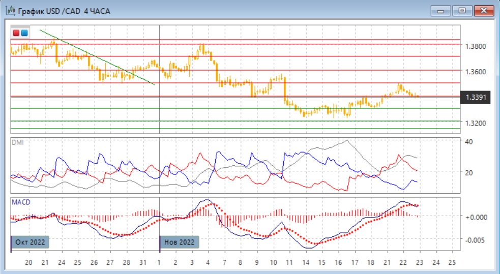 На четырёхчасовом графике пара преодолевает "круглый" уровень 1,3400. До этого образовалось медвежье расхождение максимумов пары и гистограммы MACD. Преодоление "круглого" уровня может быть подтверждением сигнала. Медвежьим сигналом является и самое преодоление уровня 1,3400, так как там можно было ожидать более сильной поддержки (около этого уровня минимумы 4-7 и максимум 17 ноября), но даже отскока вверх не произошло. Теперь, предполагая завершение коррекционного движения вверх с 16 ноября, целью видится уровень 1,3200.