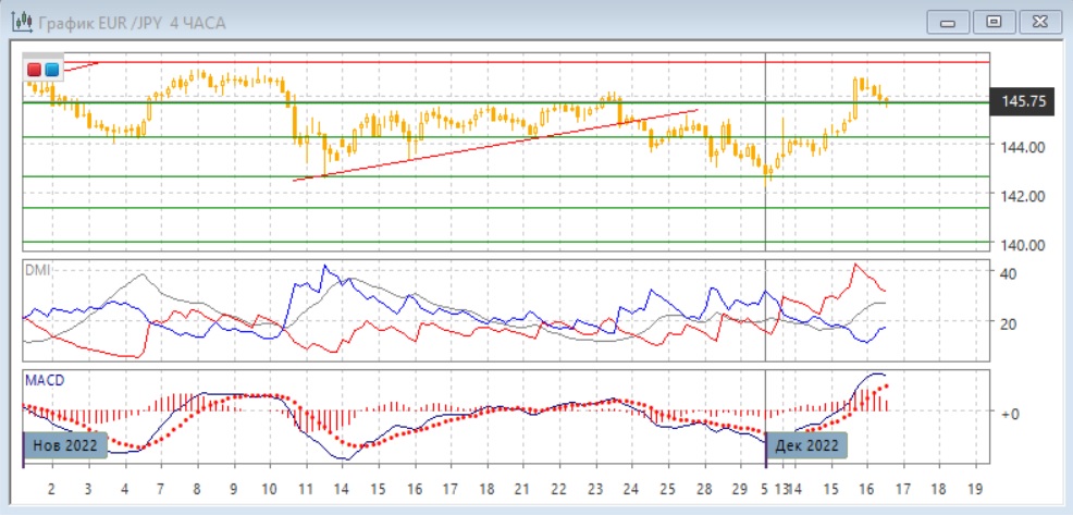 На четырёхчасовом графике пара важным является преодоление уровня 145,65, который сейчас можно рассматривать как ближайшую поддержку. Если пара снизится ниже этого уровня, она оказалась бы в диапазона со второй половины ноября на 142,70-145,75. Пока откат с 15 декабря кажется коррекционным движением к волне роста в декабре.