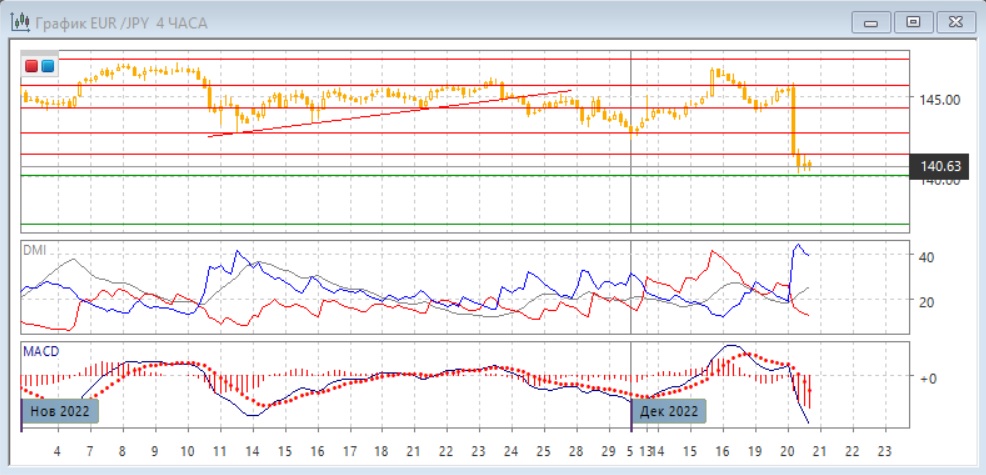 На четырёхчасовом графике пара резко вышла из диапазона вниз. Отскок от поддержки на 140,00 был небольшим, и этот уровень, вероятно, снова будет тестироваться в ближайшее время. Сопротивление пара встретила на ближайшем уровне 141,40. По индикаторам направленного движения тенденцией стало снижение: DM- значительно выше DM+, гистограмма MACD снижается в отрицательной зоне, линия MACD имеет отрицательный наклон. Более вероятным кажется, что снижение продолжится и ниже 140,00.