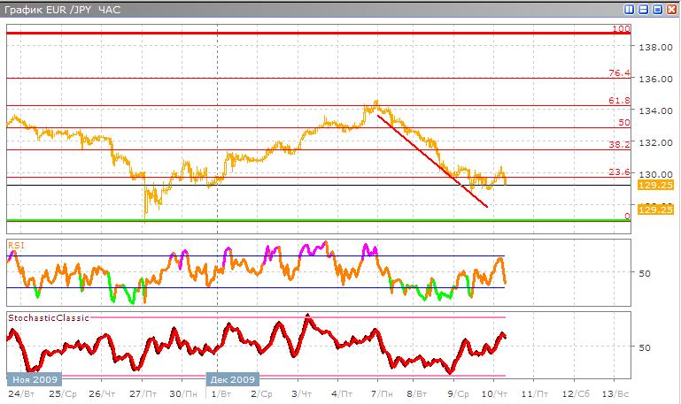 Евро-йена сейчас показывает тренд продажи, но пройдя до уровня в 23,6% по Фибоначчи, она немного остановилась и торгуется возле этого уровня, скорее всего продажа данной пары продолжится и она очень скоро достигнет 0%.