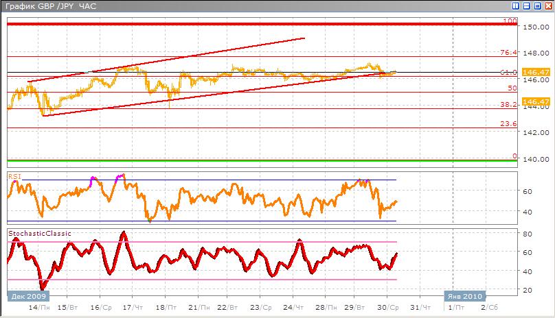 Валютная пара пробивает внизу свой канал и сейчас находится возле уровня в 61,8% по Фибоначчи, скорее всего дальнейшее движение будет проходить в боковом направлении, но сейчас произойдет коррекционное движение к 76,4% по Фибоначчи. В альтернативном варианте, возможен пробой уровня 61,8% и уход ниже него к 50%, создавая нисходящий тренд. Классические индикаторы показывают разворот к сигналу покупки Stohastic, после пересечения двух скользящих средних направляется наверх к зоне перекупленности, RSI также оттолкнувшись от зоны перепроданности направился вверх.