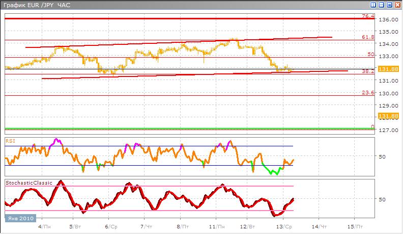 Евро-йена по-прежнему находится в боковом канале сейчас торгуется у нижней его границы в районе отметки 38,2% по Фибоначчи. Дальнейшее движение скорее всего будет направлено вверх от границы канала. В альтернативном варианте возможен пробой канала вниз и уход кросса ниже 38,2% по Фибоначчи. Классические индикаторы показывают, что сигнал покупки пока не заканчивается Stohastic вышел из зоны перекупленности и идет по направлению вверх, RSI также вышел из перекупленности.